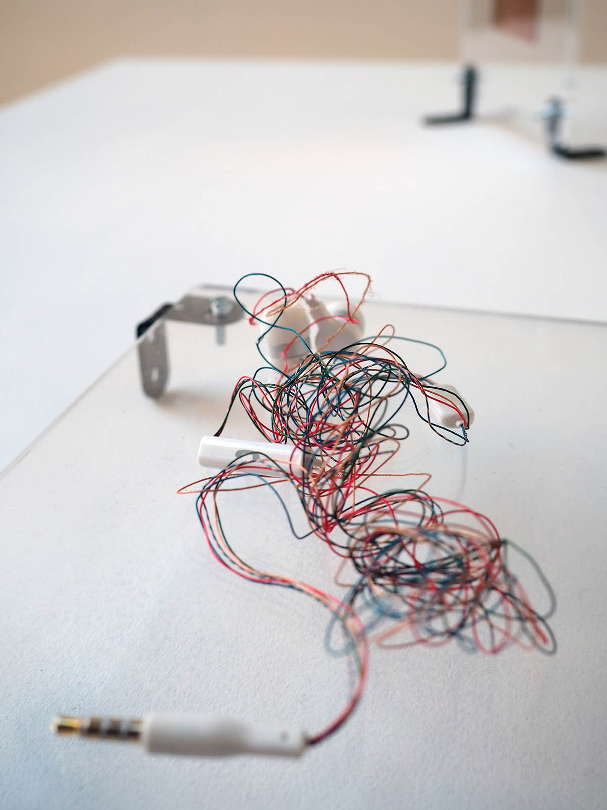 An ancient factory of metallic pieces in Belleville (Paris), abandoned until 1991, is now an art residency centre within the global economy of contemporary art and the gentrification processes that are transforming this neighborhood of Paris. My personal transport card metalized in copper -imitating a classical monument- and a pair of peeled earphones -showing the materials they are made of- become a sort of simulations of sculptures. Both pieces are placed on a table over a clean rectangle, seeking to point to the role of contemporary art as a make-up of the violence of this kind of urban transformations.